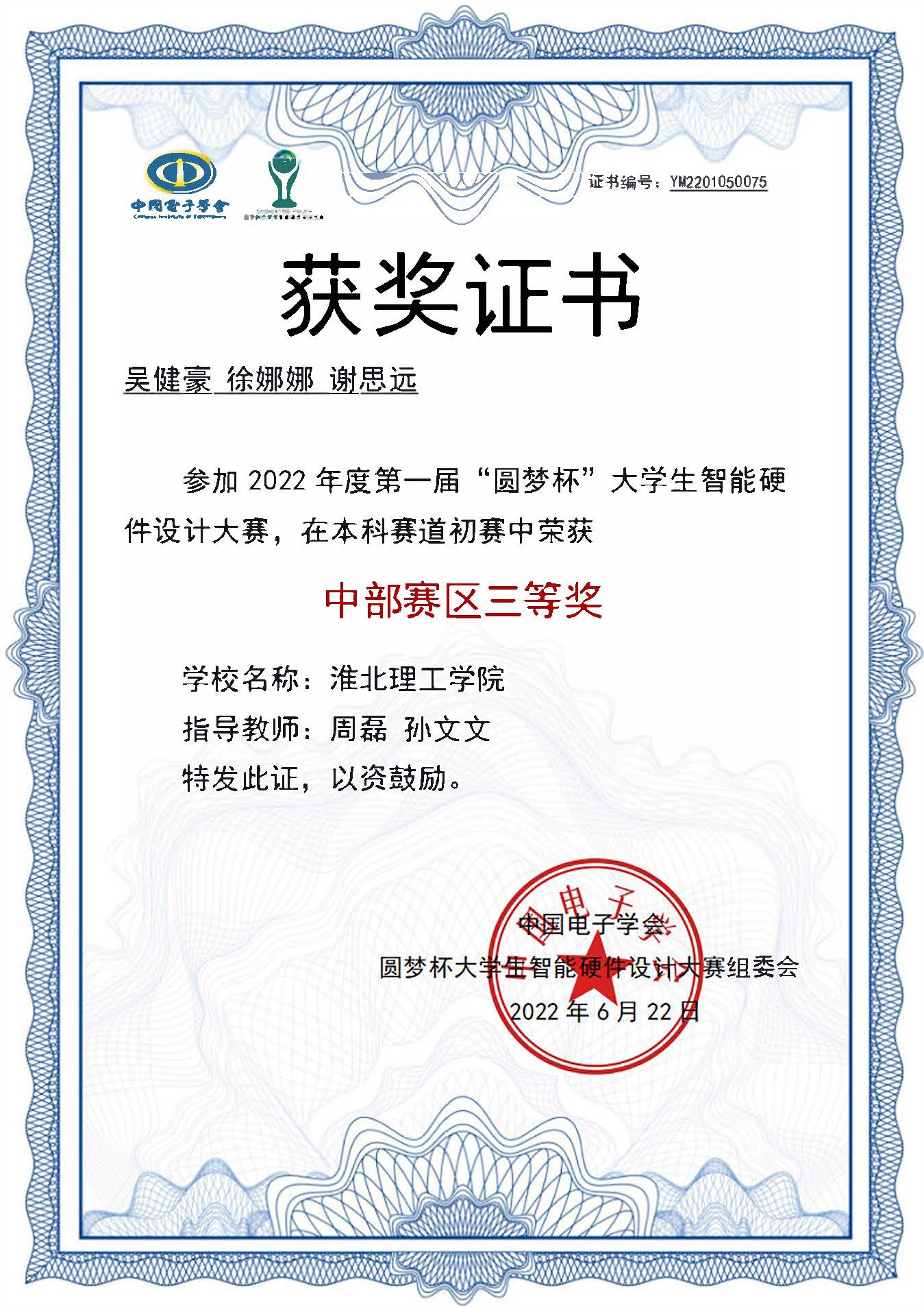 近日,由中国电子学会主办,北京航空航天大学、电子发烧友等单位承办的2022年第一届“圆梦杯全国大学生智能硬件设计大赛”的初赛落下帷幕。经过中部赛区(湖北、湖南、江西、河南、安徽)五个省份的激烈竞争后,冰球官网电子信息工程1班吴健豪、谢思远、徐娜娜同学组成的本科参赛小组荣获了中部赛区的三等奖。