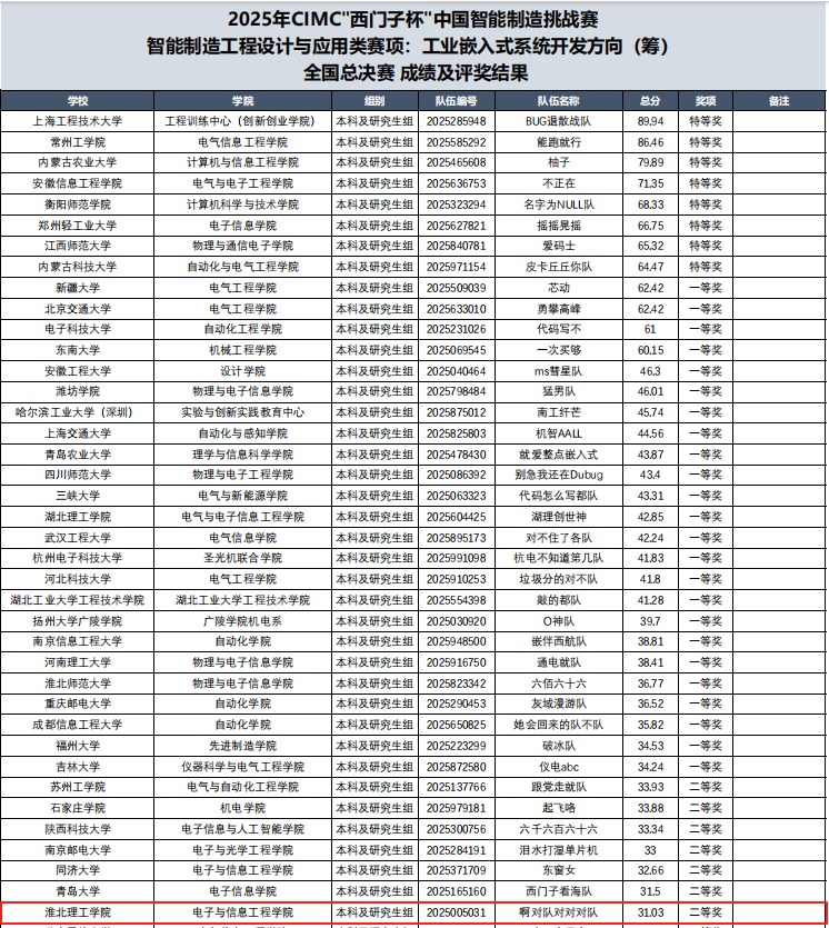 在2025年CIMC“西门子杯”中国智能制造挑战赛智能制造工程设计与应用类赛项:工业嵌入式系统开发方向(A类)中,冰球官网学子再创佳绩。经过积极备赛与激烈角逐,由曹新建老师指导的单吉祥、刘梓皓团队成功晋级全国总决赛并荣获二等奖。继去年首次参赛后,冰球官网在该项高水平赛事上实现了奖项等级的突破。 此外,冰球官网参赛队伍在全国初赛阶段表现优异,共获全国初赛一等奖2项、二等奖1项。