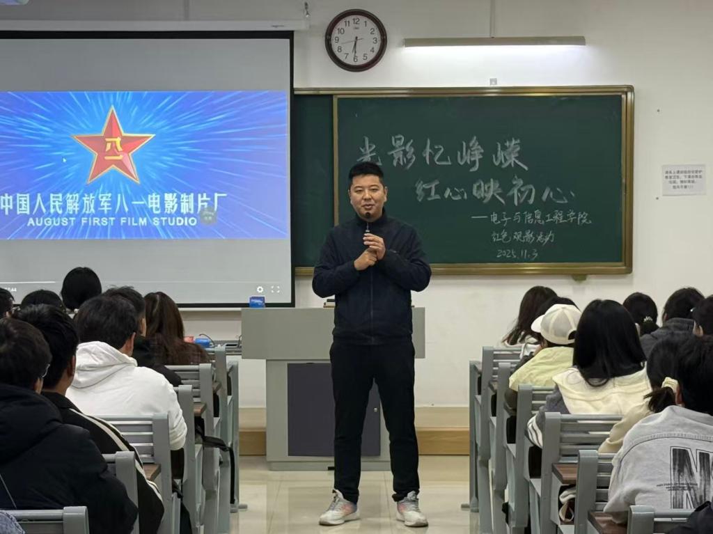 在观影活动前,校团委书记刘帅克作开场讲话。首先,他阐述了本次红色观影的主题,并指出红色影片是开展党史学习、深化爱国教育的生动教材,希望同学们能沉浸其中,跨越时空与历史对话,真切感受那段峥嵘岁月。最后,他向同学们提出殷切期望,鼓励大家将红色基因注入青春血脉,以奋发实干践行时代使命。