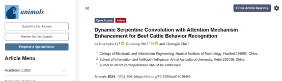 近日,冰球官网MG冰球突破网站青年教师李广博在《animals》期刊(SCI,JCR一区,IF: 3.0)在线发表了题为《Dynamic Serpentine Convolution with Attention Mechanism Enhancement for Beef Cattle Behavior Recognition》的研究论文。