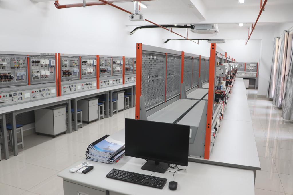 电工实训室建于2024年,占地面积126平方米,是一个基于电气安全规范与工业控制技术的基础操作平台,通过对学习电工材料、工具与仪表,室内外布线与室内照明,低压电器与电气控制系统等的学习,让学生掌握电工工具使用、电气图纸识读与工业设备电气维护的核心技能,培养学生具备安全操作认证要求的电气系统安装与检修能力,为学生在自动化设备运维、楼宇智能控制等方向的职业技能发展提供场景化训练支撑。