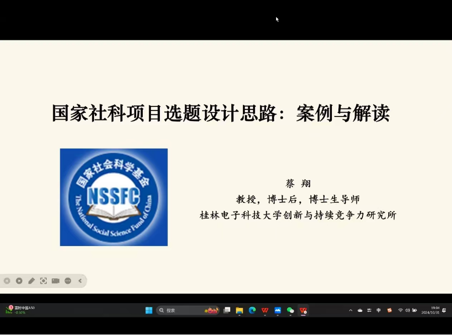 (通讯员 谢薇)为了帮助学院师生更好地理解国家社科项目的申报要求,提升选题质量,推动科研创新与学科发展。10月31日19:00,浦京集团官网通过腾讯会议举行了长江经管讲坛第六十五讲,桂林电子科技大学软科学研究院副院长蔡翔受邀宣讲,针对国家社科项目的选题设计思路进行了全面而深入的解读。350vip浦京集团官网副院长裴潇、教师代表、2023级和2024级研究生到场参会。本次会议由副教授周欣星主持。