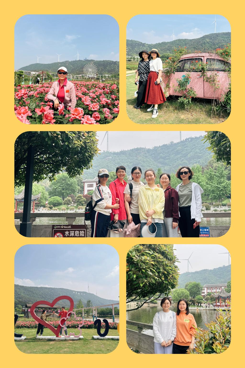 下午,全体教职工抵达桃花山脚下,进入网红打卡地桃源小镇,老师们相互为伴,在满目翠绿里,寻访陶渊明笔下的“桃花源”。大家一边欣赏着桃花山春天的美景,呼吸着清新的空气,一边与同伴热烈交流,拍照留影,兴致十足。