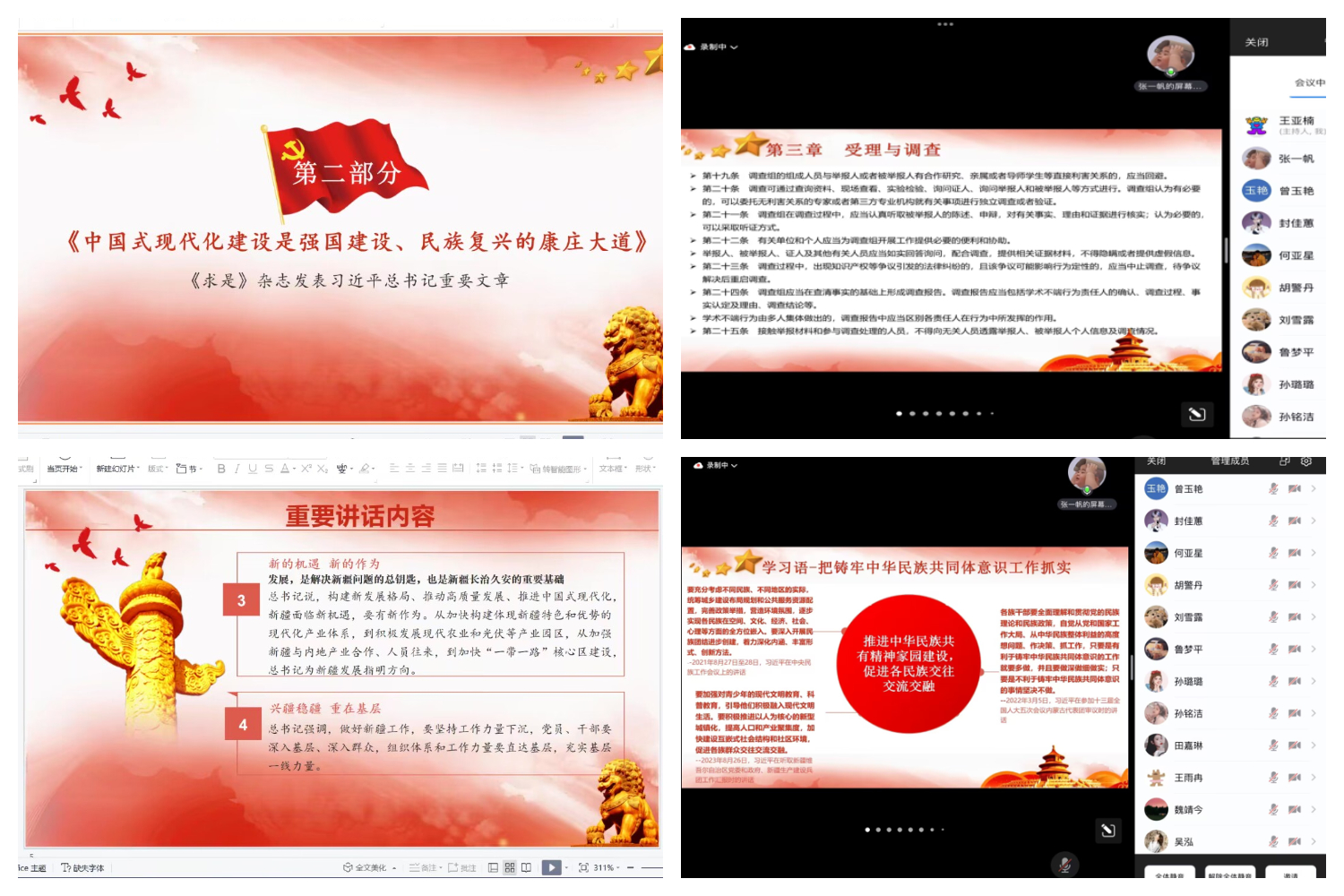 本次活动主要内容共分为六个部分。首先,讲解“习近平:牢牢把握新疆在国家全局中的战略定位,在中国式现代化进程中更好建设美丽新疆”的重要讲话内容;其次,带领大家分析《求是》杂志发表的习近平总书记重要文章《中国式现代化是强国建设、民族复兴的康庄大道》;再次,引导大家正确认识“学习语|把铸牢中华民族共同体意识工作抓实”;随后,共同学习《高等学校预防与处理学术不端行为办法》,预防学术不端行为;紧接着,体会学习“全面加强纪律建设 促进干部担当作为一一党委书记王建平在领导干部警示教育大会上的讲话”的会议精神;最后,对“直面挑战,再接再厉,以‘四个更加’理念深入推进高水平大学建设一一校长刘勇胜在新学期工作部署会议上的讲话”进行详细讲解,让大家了解到在刘校长带领下学校新学期的部署安排、理念决心。