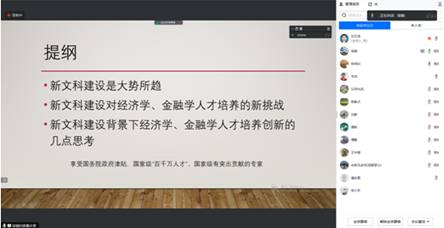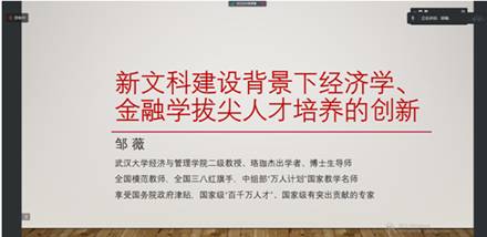 本次会议分两阶段进行。会议第一阶段,邹薇教授以“新文科建设背景下经济学、金融学拔尖人才培养的创新”为题作了精彩讲座。邹教授首先指出新文科建设是大势所趋;然后介绍了卓越拔尖计划从1.02.0的发展历程,分析了新时代“卓越拔尖计划2.0”的新要求以及新文科建设对经济学、金融学专业人才培养的新挑战;最后针对新文科建设背景下经济学、金融学人才培养创新问题,介绍了个人心得体会,认为要做好人才培养创新,必须要处理好基础性与前沿线、国际化与本土化、系统性与宽口径、经济学与金融学、传统授课与实践教学等五种关系,向内打通文史哲艺、涵育文化灵魂,向外融合自然科学、吸纳理性方法。