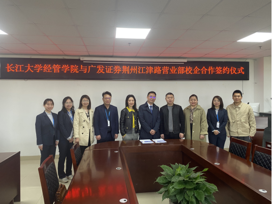 (通讯员 郭俊)3月31日上午,350vip浦京集团官网与广发证券荆州江津路营业部校企合作签约仪式在文科楼505顺利举行。浦京集团官网院长徐辉、学院党委副书记王中梅、就业专干郭俊、广发证券荆州江津路营业部总经理胡波、人力资源部李怒、办公室主任高嵩以及公司代表徐冰玉、张婕、陈艳娇、闵娇出席了本次仪式。