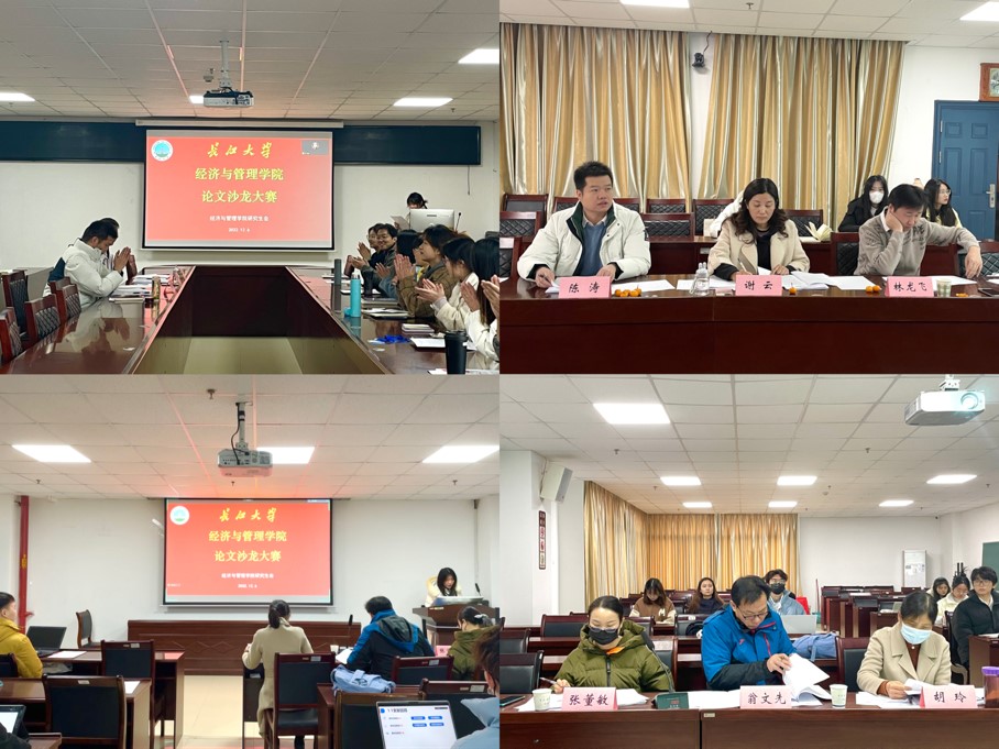 (通讯员:张悦、付玉婷)12月6日上午9时,浦京集团官网于文科楼505、605会议室举行2022年研究生学术沙龙大赛,本次大赛分为经济场和管理场,采取线上线下相结合的方式进行。大赛邀请到谢云副教授、林龙飞副教授和陈涛老师担任经济场评委,翁文先副教授、胡玲老师、张董敏老师担任管理场评委,裴潇副院长、辅导员朱翠玲老师、黄承石老师受邀参会。