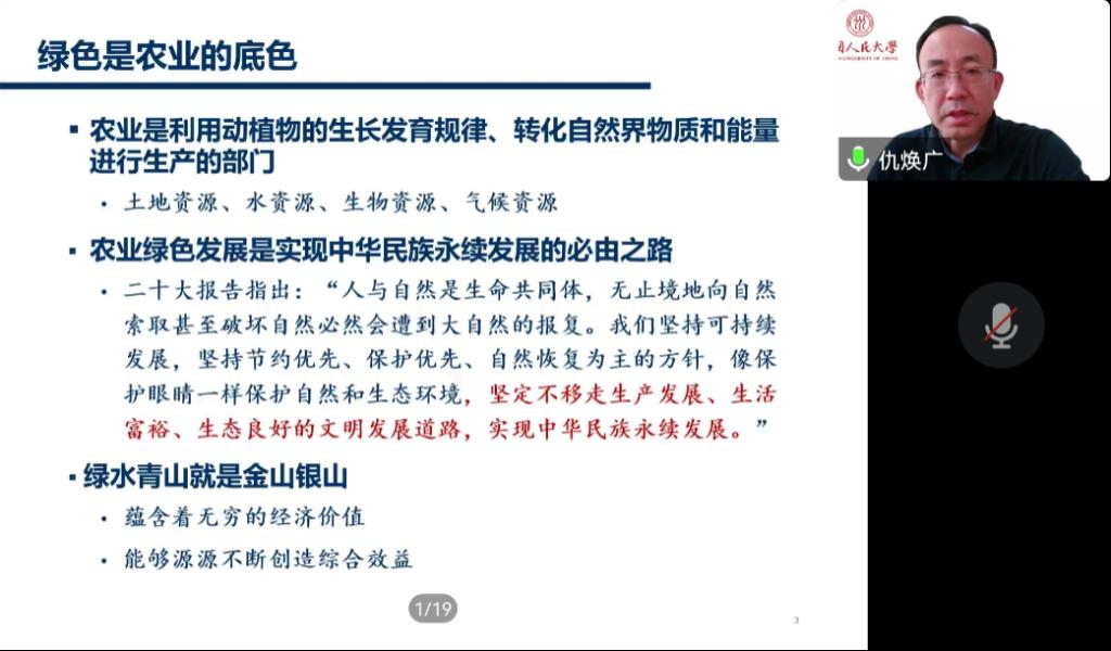仇焕广教授结合党的二十大报告、习近平总书记的三农工作思想以及农业发展进入绿色转型新阶段的现实情境,从农业绿色发展需求、农业绿色发展措施以及农业绿色发展对策三个方面进行报告。首先,仇教授针对我国农业绿色发展的背景、要求和挑战进行了深入分析;其次,从四个方面详细解读我国当前农业整治措施以及典型事实;最后讲解了解决农业绿色发展难题的两大对策:一是从政府角度加大农业生态补偿的政策,二是从市场方面促进生态产品价值的实现。