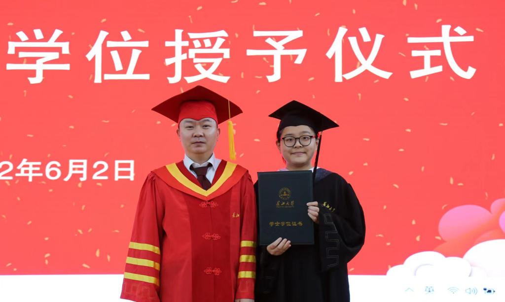 接着,学位授予仪式分上下两场依次进行,导师徐辉、陈承和何蒲明、裴潇分别上台为毕业生援正流苏,授予学士学位证书并合影留念。