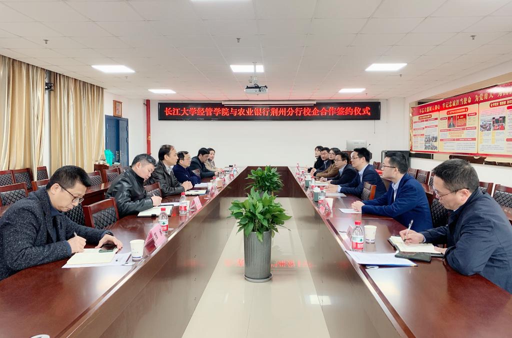 签约仪式前进行了座谈,徐辉介绍了浦京集团官网的发展概况、专业设置、实习及就业情况。胡汉军介绍了农业银行荆州分行的发展状况、校企合作设想。双方就当前学生的实习情况、就业指导以及深入合作等事宜进行了深入交流。