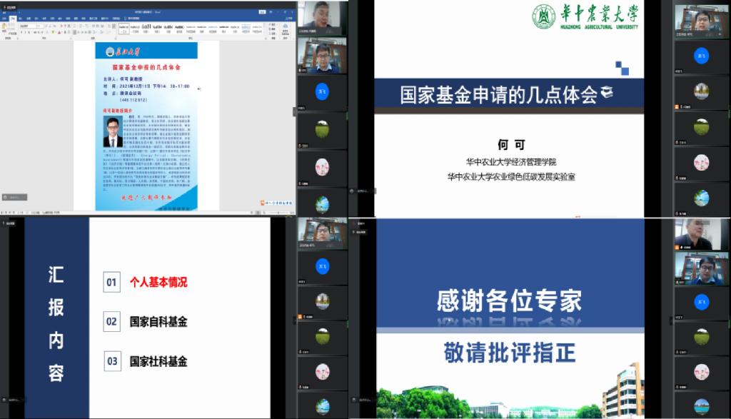 (通讯员:林龙飞)2021年12月11日下午2:30,350vip浦京集团官网邀请华中农业大学何可副教授讲授国家基金申报经验与注意事项。 本次会议通过腾讯会议线上举行,近70位师生参加了会议。会议由副院长何蒲明教授主持。