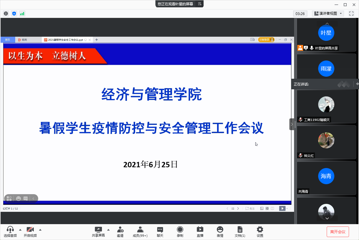为切实做好2021年暑假学生安全教育管理工作,增强暑期留校生安全防范意识,625日下午3点,经济与管理学院在线上召开2021年暑假学生疫情防控与安全管理工作会议。党委书记樊帆、党委副书记王中梅、全体辅导员、班主任、各班班长和副班长参加会议,会议由王中梅副书记主持。