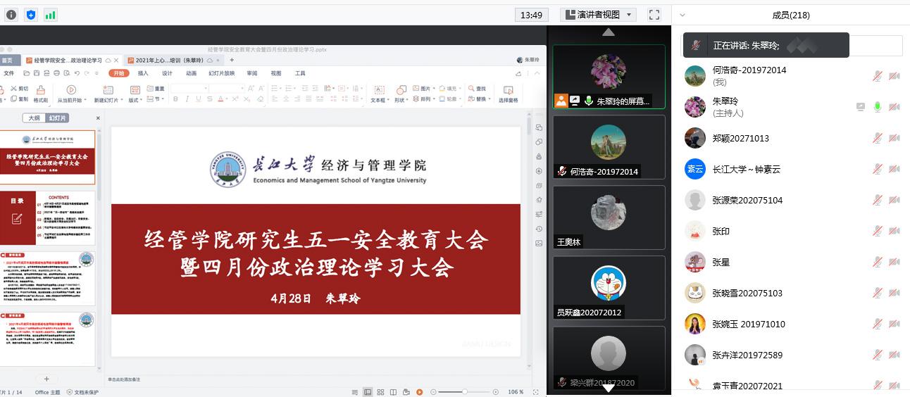 (通讯员 王雪婷)4月28日晚,浦京集团官网研究生线上组织开展了研究生五一安全教育大会暨四月份政治理论学习大会,学院党委副书记王中梅、研究生辅导员朱翠玲及全体研究生参加会议。