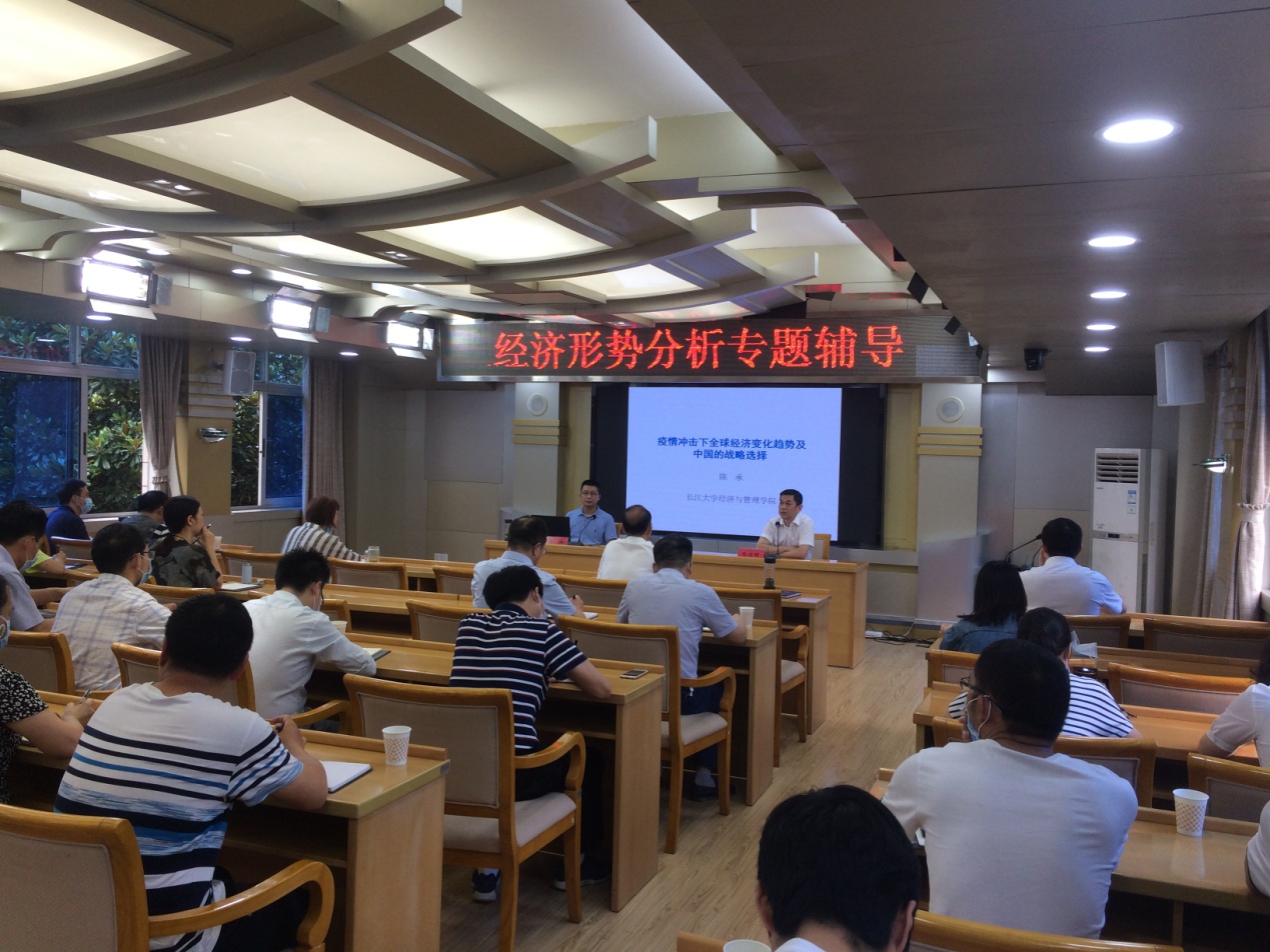 (通讯员 黄胜胜)为了更好的服务荆州市地方经济社会发展,促进荆州市疫情防控常态化趋势下更全面有效的复工复产复学。2020年7月17日下午,受荆州市政府办公室邀请,350vip浦京集团官网副院长陈承教授作了《疫情冲击下全球经济变化趋势及中国的战略选择》主题报告。会议由荆州市政府副秘书长朱启明主持,荆州市政府办公室、市政府研究室部分领导班子成员、全体机关干部和系统单位负责同志聆听了此次报告。