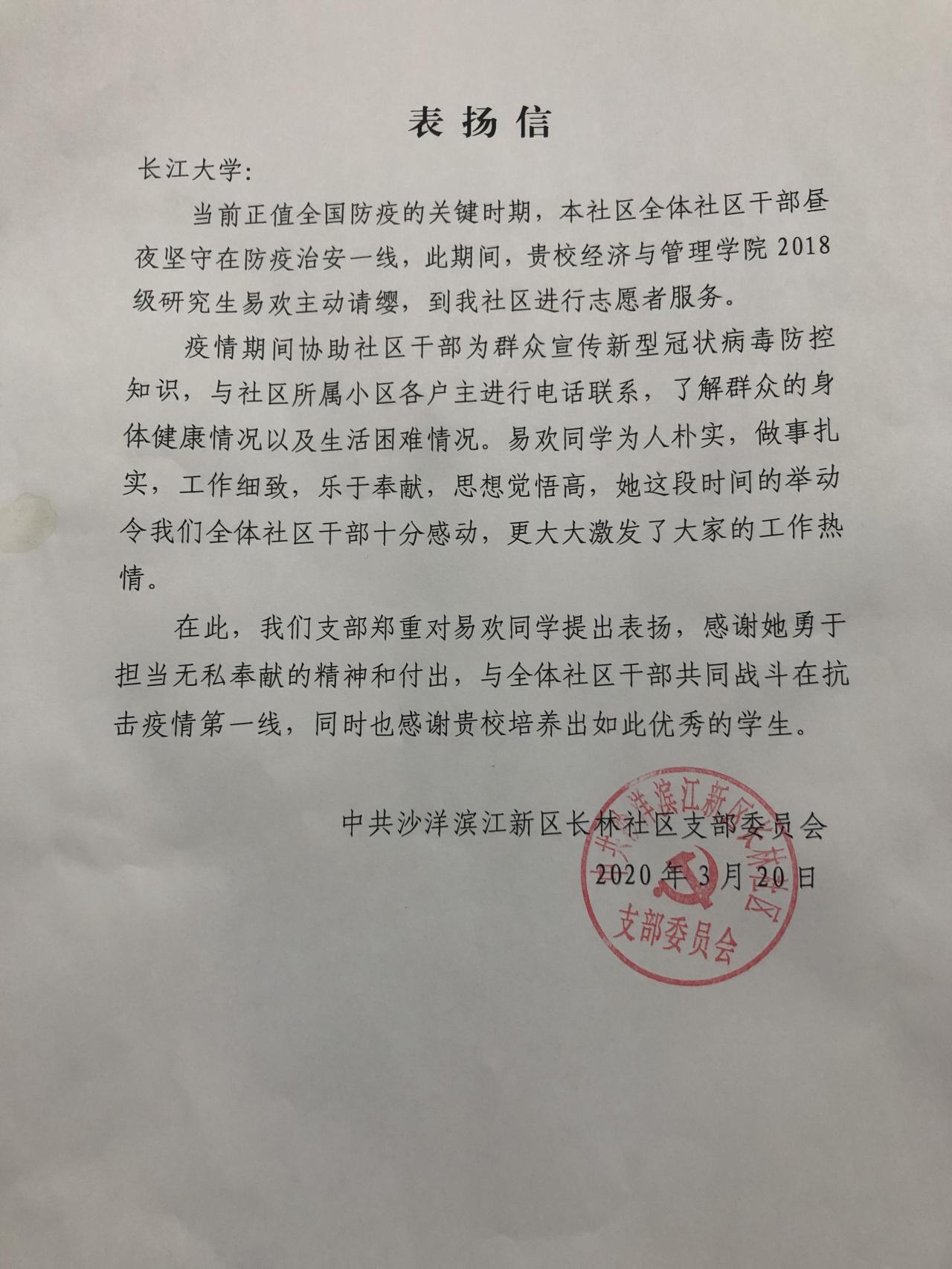 近日,浦京集团官网收到来自荆门市沙洋县长林社区对浦京集团官网研究生易欢的感谢信,信上感谢了易欢同学自2月12日以来主动请缨担任防疫志愿者,并无私、出色地完成任务。