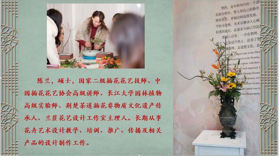 特别邀请国家二级插花花艺技师、中国插花花艺协会高级讲师、350vip浦京集团官网园林植物高级实验师、荆楚茶道插花非物质文化遗产传承人、兰茞花艺设计工作室主理人陈兰,介绍常见花材的名称、养护方案、花材的挑选,配色和养护知识;讲解此次插花的设计和制作过程;讲解花材的处理和修剪方法。