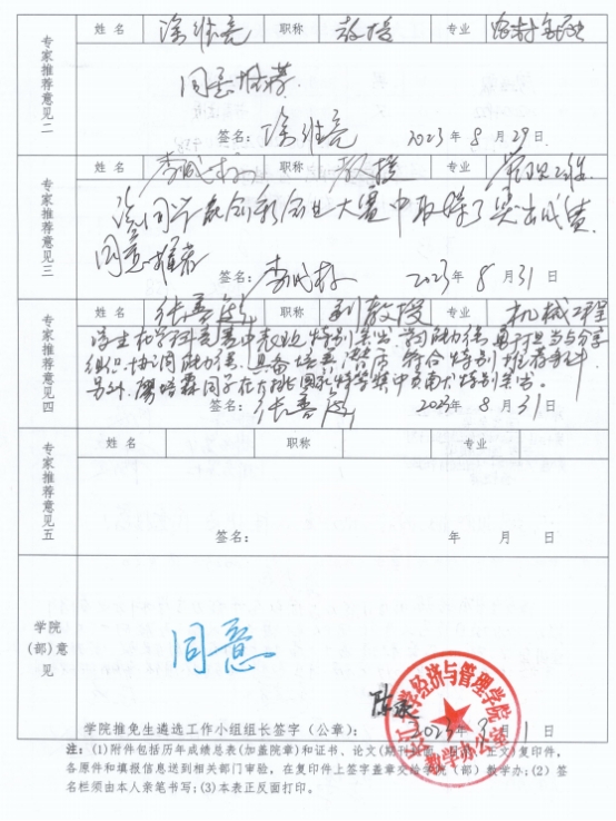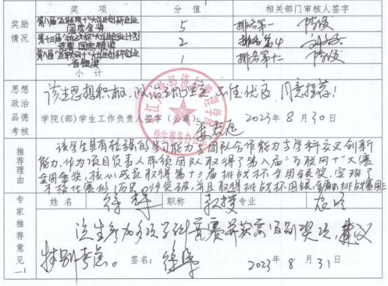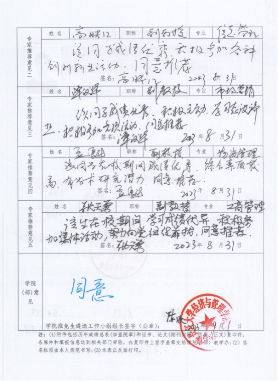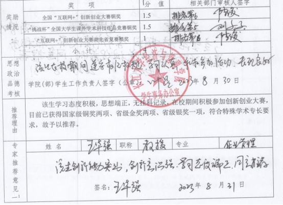 冯硕,男,学号202003175,学院信息管理与信息系统专业本科生。获得全国“互联网+”创新创业大赛铜奖 、“挑战杯”全国大学生课外学术科技作品竞赛铜奖和“互联网+”创新创业大赛湖北省复赛银奖;廖培霖,男,学号202004912,学院金融学本科生。获得第八届“互联网+”大学生创新创业国家金牌、第十三届“挑战杯”大学生创业计划竞赛国家银奖和第八届“互联网+”大学生创新创业省银奖。根据《350vip浦京集团官网推荐优秀应届本科毕业生免试攻读硕士学位研究生管理办法(试行)》(长大校发 〔2020〕106号)和关于做好推荐2024届优秀本科毕业生免试攻读硕士学位研究生工作的通知》等文件精神和通知要求,9月1日13:00-13:30在文科大楼417开展特殊学术专长答辩会,经答辩决定同意冯硕和廖培霖进行2024届研究生推免申请(不是正式推免)。 现通过350vip浦京集团官网网站主页予以公示,公示日期为2023年9月1日至2023年9月3日,如有异议,请于2023年9月3日前与学院教学办联系,电话:0716-8060985。先将材料公示如下: