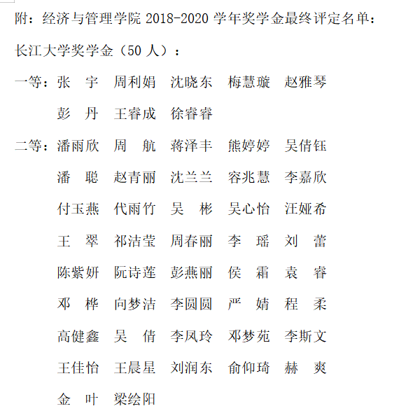 为激励浦京集团官网学生勤奋学习、努力进取,使家庭经济困难品学兼优的学生通过自身的努力和学院资助顺利完成学业,帮助经管学院学子顺利成长成才,结合浦京集团官网实际情况,浦京集团官网认真进行了评选工作,根据个人申报、学院审核、最终评审,确定张宇等85人获评奖学金,特此公示。