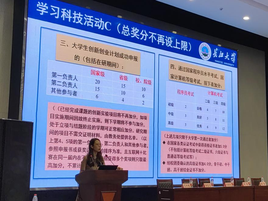 大会上,方含之老师就本学年综测统计工作作出说明,分别从道德素质、学业成绩、身心素质、创新实践能力、学院特色及组织这六个方面进行详细讲述,其中重点针对综测计算步骤、学分绩点计算方法以及注意事项等方面进行讲解,确保综测成绩准确无误。在讲解结束后,方老师逐一解答各班同学的疑惑,确保同学们都熟悉细则规定,从而保证全部班级能严格执行学院关于综合测评工作的各项要求。