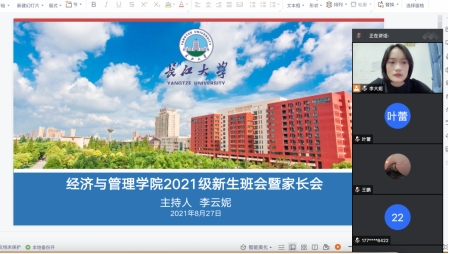 为促进家长和2021级新生更加深入地了解大学学习和生活,实现“家+校”零距离沟通,8月27日晚上,经济与管理学院组织召开2021级线上新生班会和家长会。党委副书记王中梅及新生辅导员李云妮、郭俊和别凡出席会议。