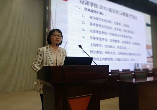 会议伊始,任玉婷老师根据经管学院2019级学生日常管理规定,对学风建设目标、学习纪律、寝室纪律、请销假流程、周末晚点名等事项提出具体的要求。