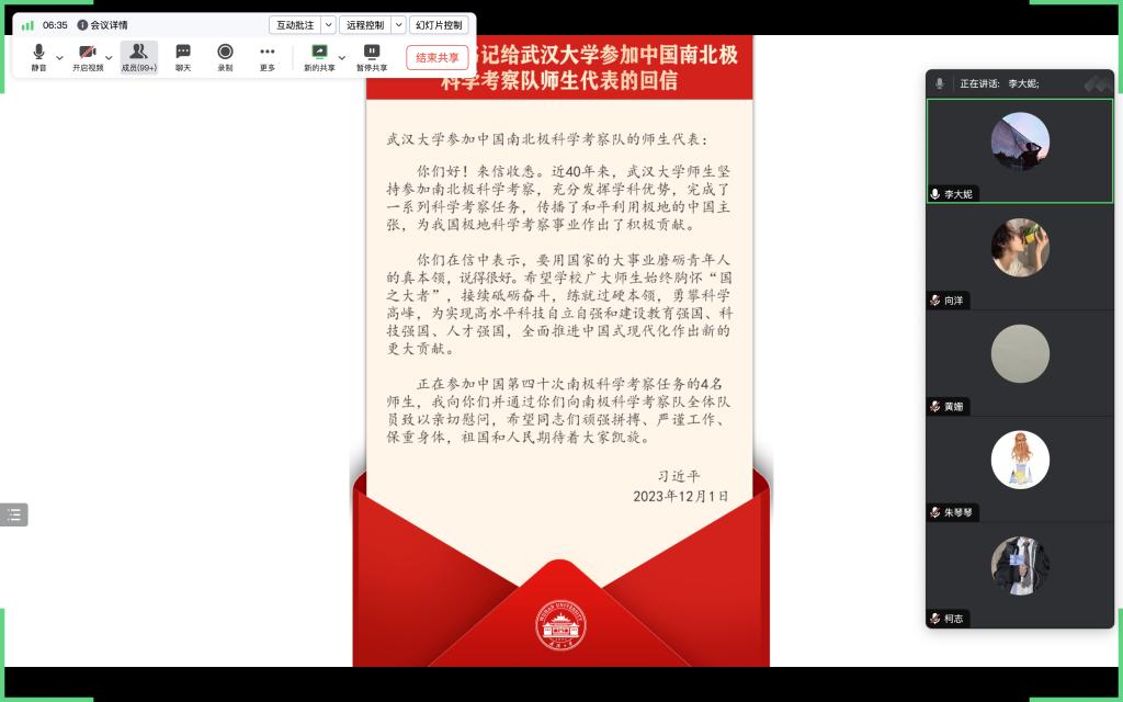 辅导员在本科生班级通过腾讯会议认真组织开展学习“习近平总书记给武汉大学参加中国南北极科学考察队师生代表的回信”的线上主题班会,激励学生砥砺前行,奋发上进,为建设中国式现代化伟大事业和中华民族伟大复兴而接续奋斗!