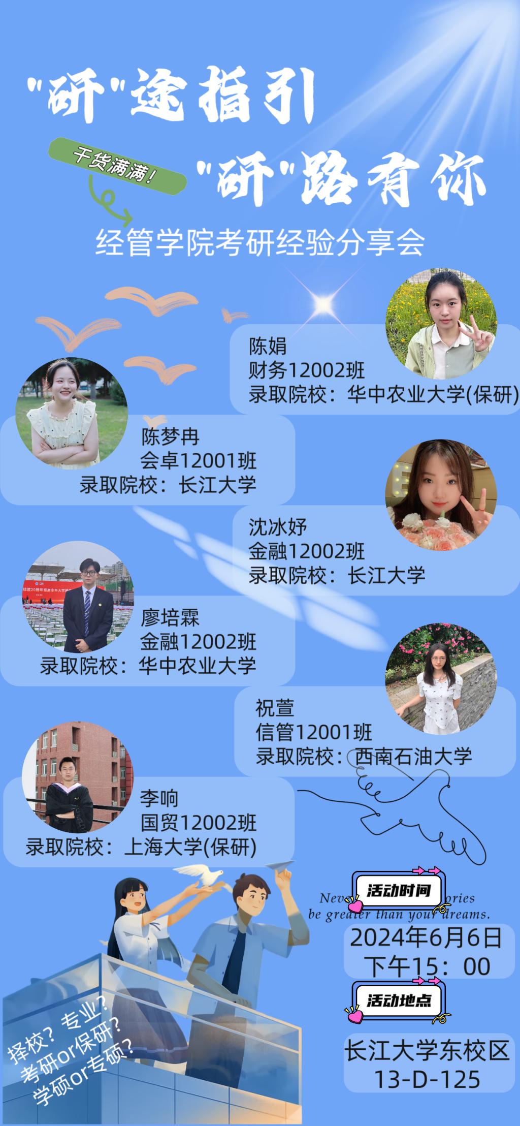 (通讯员 单子浩)为助力350vip浦京集团官网学子了解考研形式,进一步明确考研规划。2024年6月6日下午,经管学院开展“研”途指引、“研”路有你——考研经验分享会。本次分享邀请了2024届升学上岸学子陈娟、陈梦冉、沈冰妤、廖培霖、祝萱、李响,2022级辅导员桂凯丽、方含之和2022级、2023级学生参加。