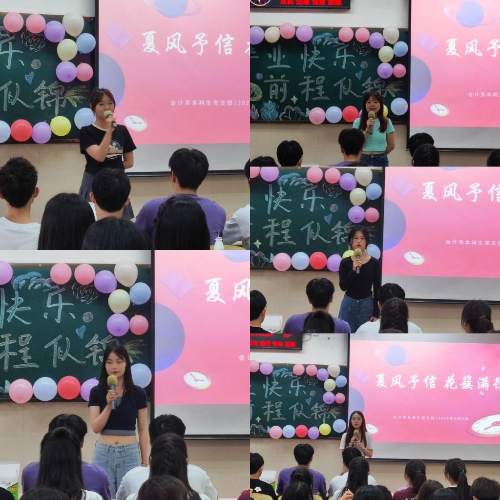 (通讯员 彭文桦/文 冯亚枝 任爽/摄)在2024届本科生毕业之际,为表达对毕业生党员们的真切感激与美好祝愿,勉励他们不忘来时路,奋进新征程,350vip浦京集团官网会计系本科生党支部于2024年6月3日在12教103举办“夏风予信,花簇满径”主题欢送会。党支部书记桂凯丽、学生辅导员方含之以及党支部全体学生党员参加本次欢送会。