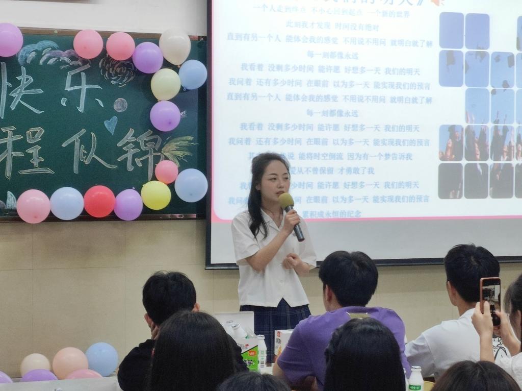 音符跳跃,旋律飞扬。2021级同志们以一曲歌曲串烧点燃了青春的火焰。歌声悠扬婉转,传递着彼此之间的情谊,诉说着青春的美好,同时也承载着离别的不舍。现场的同志们纷纷亮起手机闪光灯,点点微光汇成璀璨星河,随着音乐的节奏一同挥动,点亮了本次晚会的高光时刻。随后,主持人宣布开启新一轮的游戏环节—“闹钟炸弹”。时间不停流逝,大家心弦紧扣,无人知晓“炸弹”将在谁的手中“引爆”。游戏过程中,各类千奇百怪的问题引得大家开怀大笑。几轮游戏过后,主持人邀请了陈娟同志为大家分享学习经验,陈娟同志结合自身保研经历向大家分享了学习方面的建议,并鼓励支部的同志们自强不息,努力奋进。