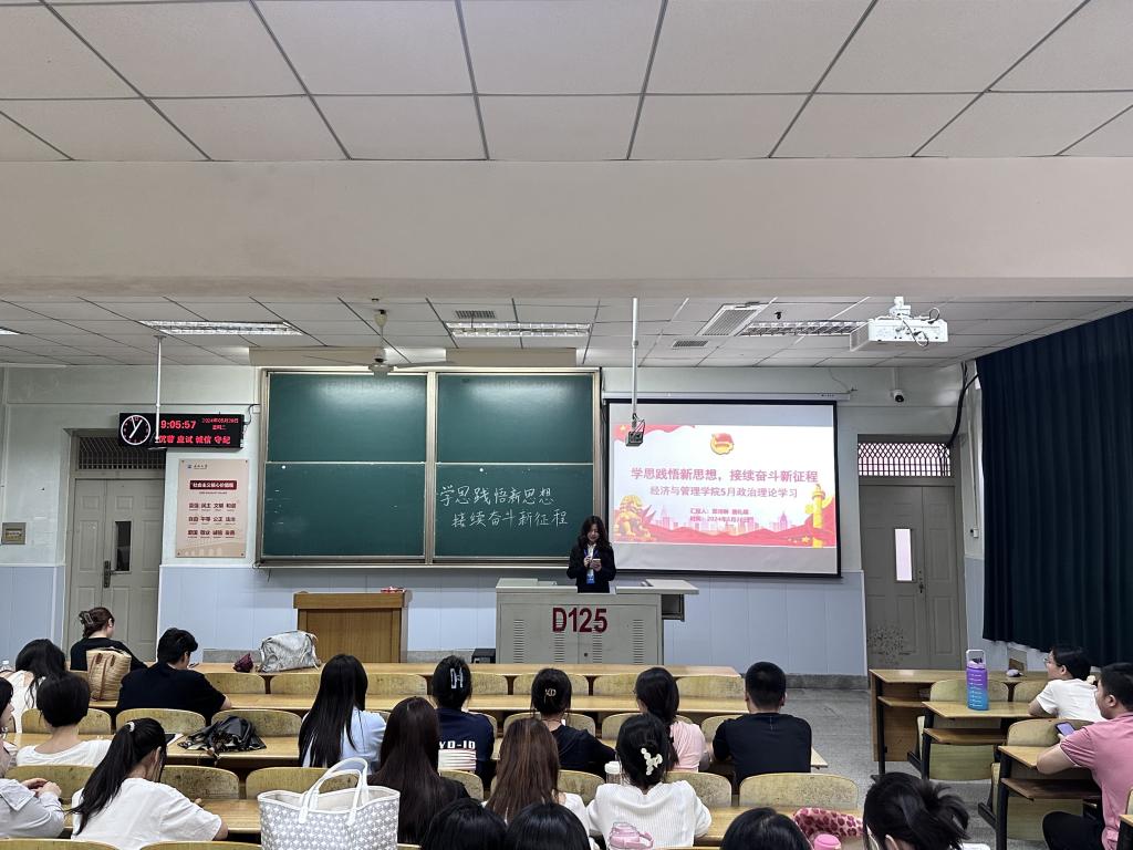 (通讯员 郑婉君)为深入学习贯彻习近平新时代中国特色社会主义思想,进一步增强“四个意识”、坚定“四个自信”、做到“两个维护”,提升浦京集团官网研究生政治理论素养,深刻认识和准确把握党的二十大重大主题、重大理论观点、重大战略思想,2024年5月28日19:00,350vip浦京集团官网在13教D-125教室开展了研究生五月政治理论学习。本次学习以“学思践悟新思想,接续奋斗新征程”为主题,由浦京集团官网2023级研究生章诗琳和唐礼蝶同学担任主讲人,全体2023级研究生到场参会。