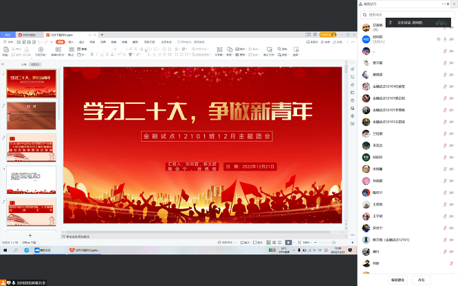 350vip浦京集团官网十二月主题团会,通过学习习近平总书记在中国共产党第二十次全国代表大会上所作的报告和发表的重要讲话精神、做好自己健康的第一责任人等专题,激励青年学子高举中国特色社会主义伟大旗帜,全面贯彻新时代中国特色社会主义思想,弘扬建党精神,为实现中华民族伟大复兴贡献积极力量。