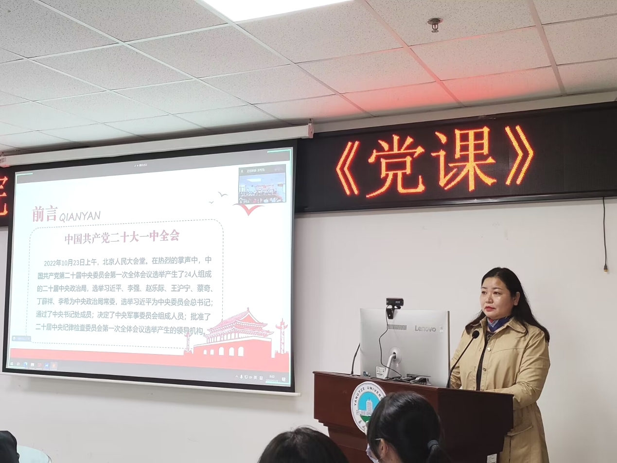 王中梅以“深入学习贯彻党的二十大精神,深刻把握中国共产党人的初心与使命”为主题进行授课。会中,她从三个方面对二十大报告进行了阐释,着重向参会人员介绍了党的二十大的会议主题、会议内容、会议意义等,并就中国共产党的初心与使命进行详细解读,引导同学们正确认识中国共产党人实现初心与使命的奋斗历程,领会党的二十大的重要意义。