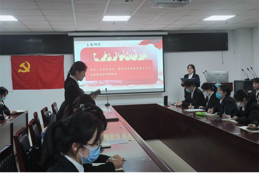 在学习研讨环节,主持人卢婧羽同志围绕党的二十大报告,以生动有力的话语带领党员同志们回顾了二十大的重大意义、重要指示以及主要内容。随后三名同志分享了自己的学习心得,吴婷婷同志认为作为青年党员应当向优秀党员看齐,始终坚持初心如磐,使命在肩,成为建功新时代的青春主力;陈娟同志提到,在日常学习生活中需及时总结过去,勇于自我革命,不断增强自我净化、自我完善、自我革新、自我提高的能力,努力做到“以志为先,以新为径,以苦为食”,永远怀着“赶考”的清醒和谨慎,保持“斗罢艰险又出发”的顽强意志;郭斯齐同志激励党员同志们要立足新时代,听党话,跟党走,积极投身到服务群众的实践中,努力成长为堪当民族复兴大任的时代新人!