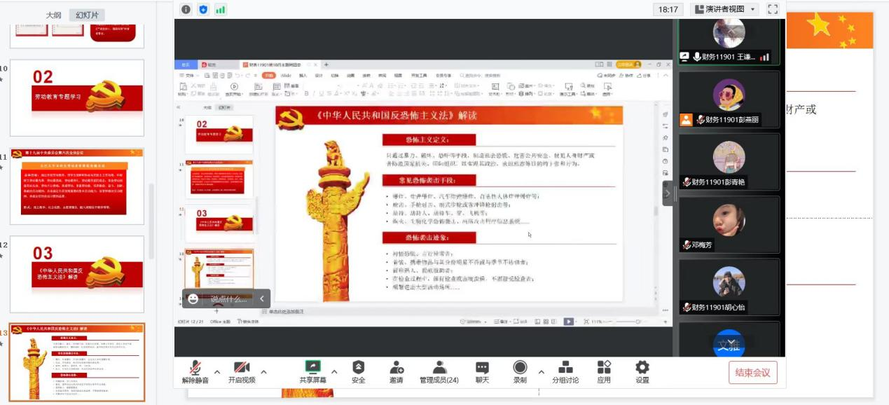 财务11901班团支部开展视频连线活动,由活动负责人带领同学们解读《中华人民共和国反恐怖主义法》。解读过后,同学们深化了对总体国家安全观的认识,坚定高举中国特色社会主义伟大旗帜。