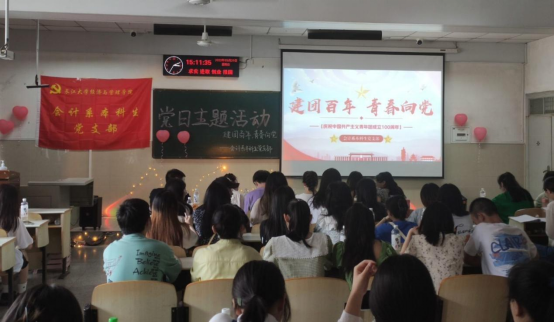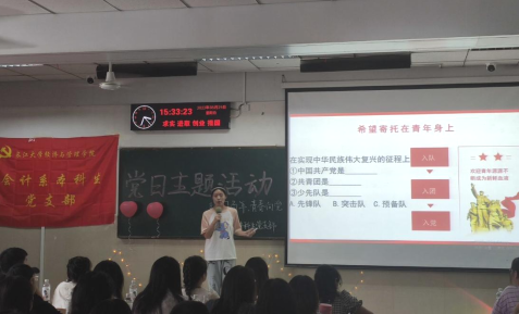 (通讯员:陈娟、高仁东)为传承“五四”精神,学习贯彻习近平总书记在庆祝中国共产主义青年团成立100周年大会上的讲话精神,培养青年生逢盛世,担当作为的情怀,350vip浦京集团官网会计系本科生党支部在5月29日于12教103开展了“建团百年,青春向党”主题党日活动,参与此次活动的有支部学生党员和预备党员。