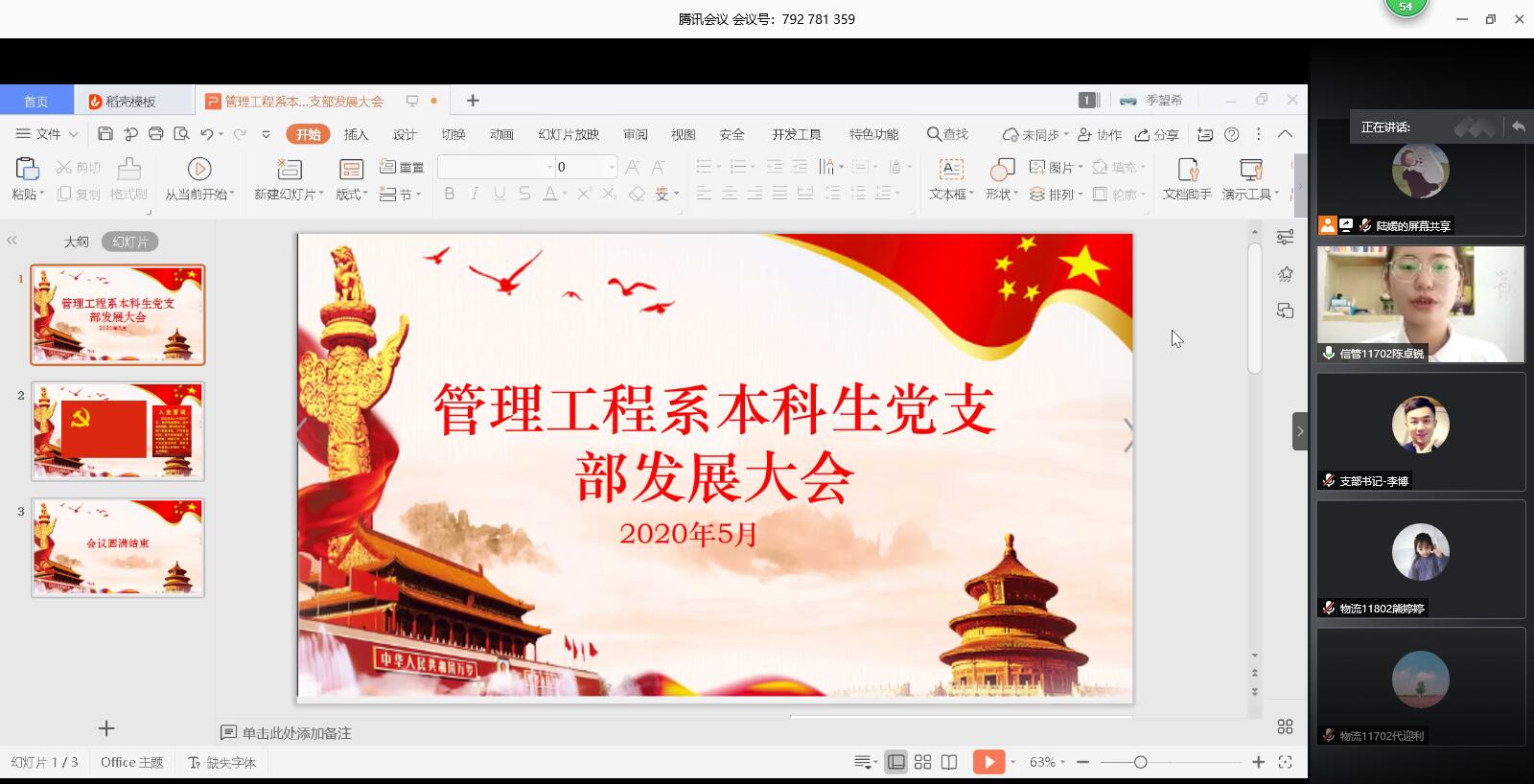 2020年5月25日下午2点,350vip浦京集团官网管理工程系本科生党支部在腾讯会议上召开了党员发展大会。会议主要目的是讨论关于发展陈卓锐等6名同志为预备党员的事宜,本次会议由陆媛主持,参加人员主要有管理工程党支部书记李博老师、8位正式党员、14位预备党员以及6位发展对象。