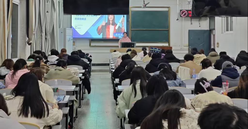 活动共分为三个部分。首先,各班详细学习了《学位法》的立法背景、主要内容和实施意义。学位法构建了分级分类的学位制度,根据学士、硕士、博士三个层级不同要求,明确并细化了学位授予条件。紧接着,各班对《学位法》的具体规定进行了细致了解,如学位工作体制、学位授予资格、学位授予条件、学位授予程序、学位质量保障等方面,并对学位法中关于学位授权审核、学位授予标准、学位管理监督等规定进行了深入解读。最后,报告的学习强化了学生对学位法规范学位授予行为、保障学位授予质量、维护学术诚信和学位尊严重要性的理解。