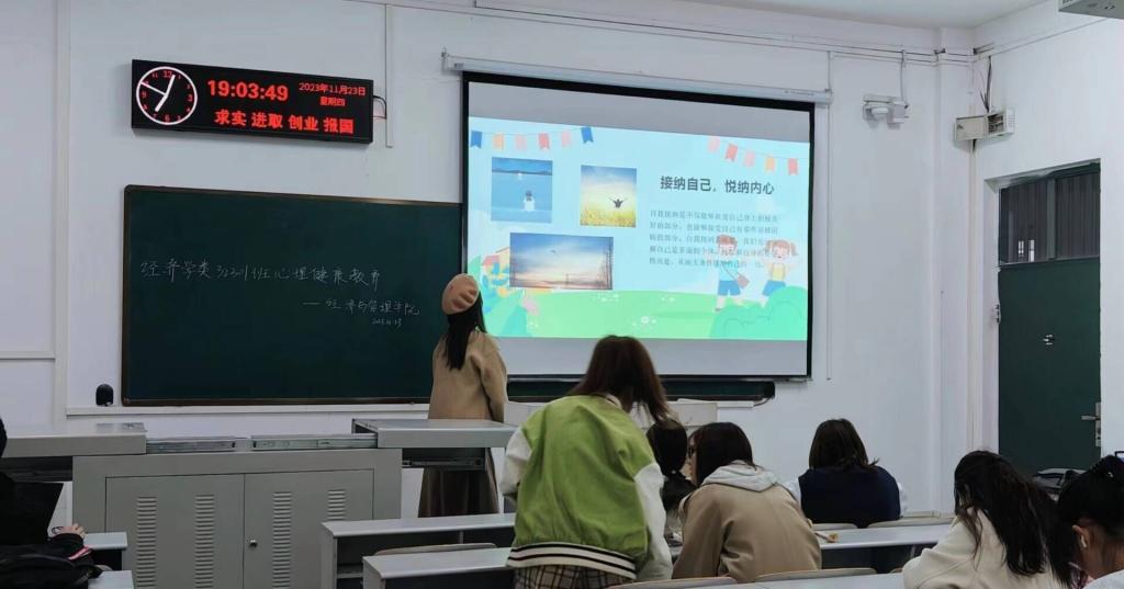 首先,心委和同学们一起学习了解心理健康的意义,认识心理健康的重要性。接着,她们向同学们介绍阅读的意义,通过观看相关心理健康教育短视频,探讨交流目前互联网上较热的“精神内耗”话题,告诉同学们:也许我们并不完美,但我们都在努力向前。呼吁同学们在最好的年华要多读书,因为读书可以让我们获取知识与技能、拓宽视野、充实头脑、治愈心灵,懂得悦纳自己,学会帮助他人。班会最后,为检验学习效果,心委组织同学们进行心理健康知识竞答,同学们踊跃发言,现场气氛热烈。