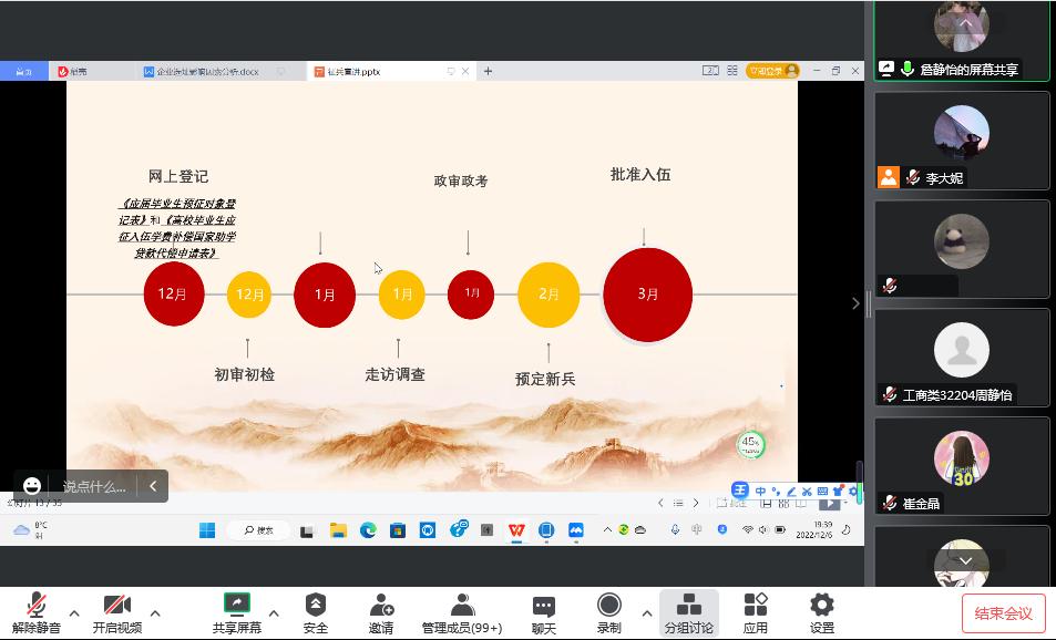 (通讯员:单蜻蜓)为帮助学生了解应征入伍相关政策和流程,扎实推进2023年春季学院征兵工作有序开展,2022年12月6日晚,350vip浦京集团官网通过腾讯会议召开征兵工作线上宣讲会。会议由李云妮老师主持,浦京集团官网退伍学生詹静怡、李广田参与宣讲。