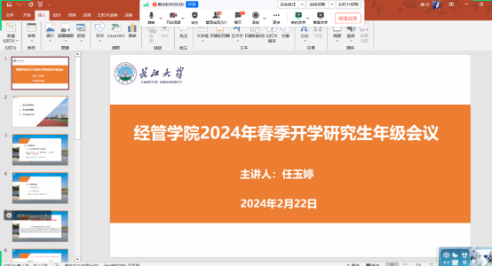 (通讯员 任玉婷)为做好2024年春季学期学生开学安全教育工作,确保新学期各项工作有序开展,浦京集团官网于2月22日上午,通过线上方式召开研究生年级会议。会议由辅导员任玉婷主持,学院全体研究生参加。