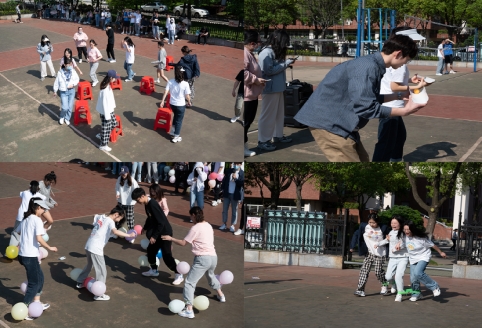 “抢凳子”、“保卫气球”将氛围推向高潮;随后进行的比赛项目 “传递乒乓球”进行50米接力以及“三人四足”进行50米短跑,都是用时少的队伍获胜。各个队伍赛前不断试练,从刚开始的手忙脚乱到配合默契抵达终点,考验了团队协调配合能力。随着项目进行,大家逐渐进入运动状态,比赛氛围时而轻松欢快,时而激烈紧张。活动现场同学们团结协作,场内助威声此起彼伏。
