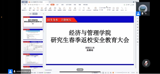 (通讯员:程思佳)为了落实学校2022年春季学期开学的相关工作,引导学生做好疫情返校期间的各项事宜,经管学院于2月16日下午4:00,通过腾讯会议召开研究生返校安全教育大会。全体研究生参加了本次会议,会议由辅导员朱翠玲老师主持。
