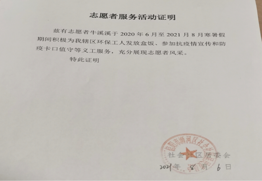 今年暑假七月份,河南郑州发生特大洪水灾害,当刘溪溪了解到家乡附近很多地方与家庭都需要帮助,虽然遗憾没能去灾害现场志愿服务,但通过协会联系上需要学习辅导帮助的家庭后,她及时与学生父母沟通后合理安排线上下相辅方式免费辅导,家教完她也会根据值班表前往家所在社区体温检测点值守。
