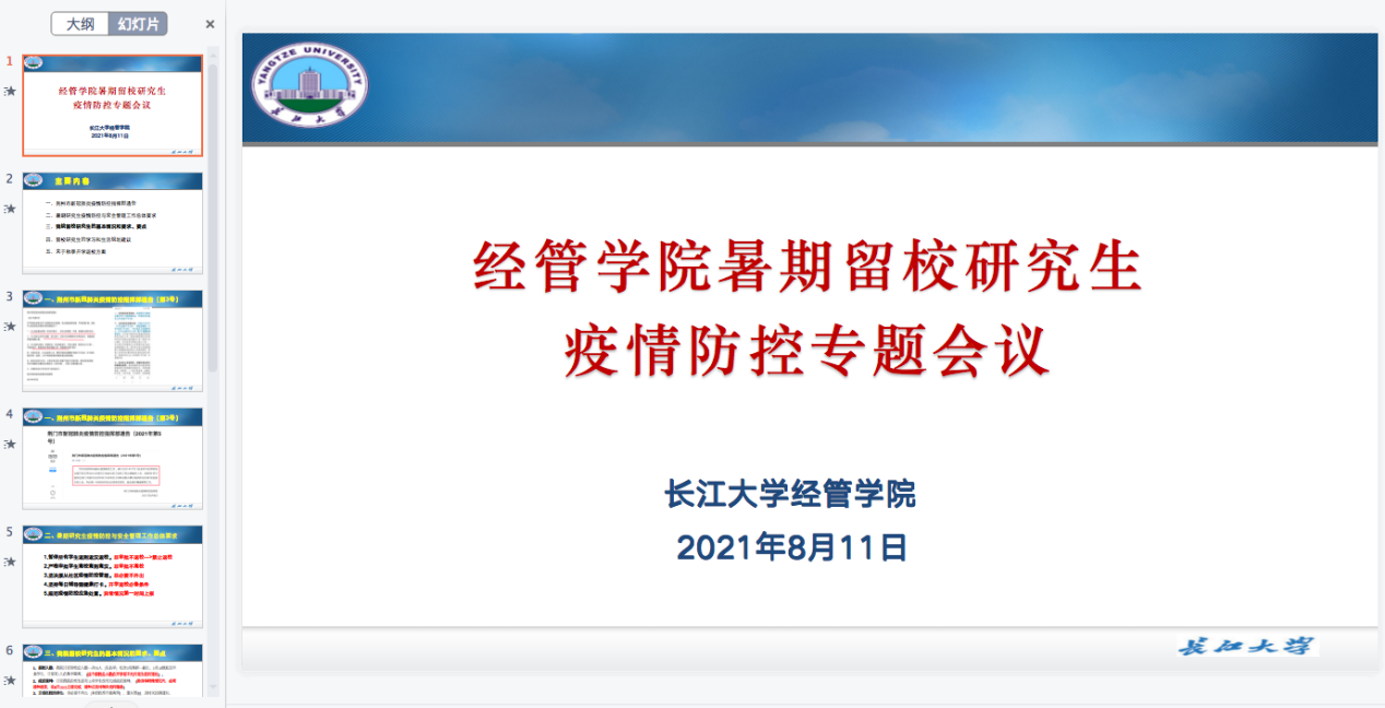 会上,朱老师首先传达了近期荆州市和学校关于疫情防控的重要指示及相关通告精神暑期研究生疫情防控与安全管理工作提出了总体要求:禁止学生返校;非审批不离校;坚持每日健康打卡、尽快接种疫苗。另外,朱老师对学生身心健康、学习状态、求职规划给出了诸多建议,为开学做好准备。