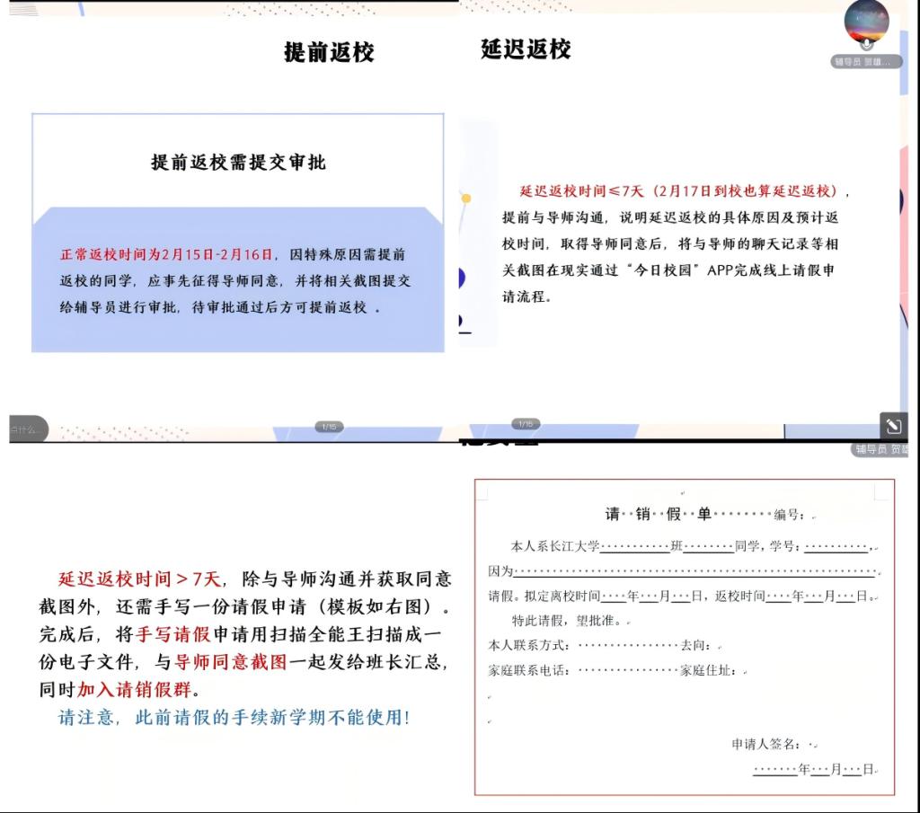 对于因特殊情况需要提前返校或是延迟返校的学生,贺老师规范了相关手续。必须先确保导师知情,最终提交给辅导员审核。通过清晰明确的流程规范,确保每位同学都能准确了解并依规执行。