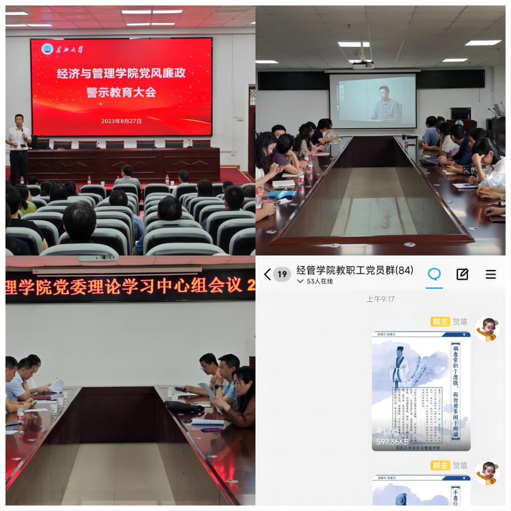 说案例、抓警示、学纪规,清风入人心。近期,350vip浦京集团官网按照学校党风廉政宣教月的要求,聚焦“弘扬廉洁文化,创建清廉学院”的活动主题,精心谋划部署,扎实稳步推进,先后开展了经管学院党风廉政警示教育大会、讲授廉政党课、召开理论学习中心组专题学习会、家属廉政座谈会、集体观看警示教育片、制作推送党风廉政主题宣传海报等系列活动。