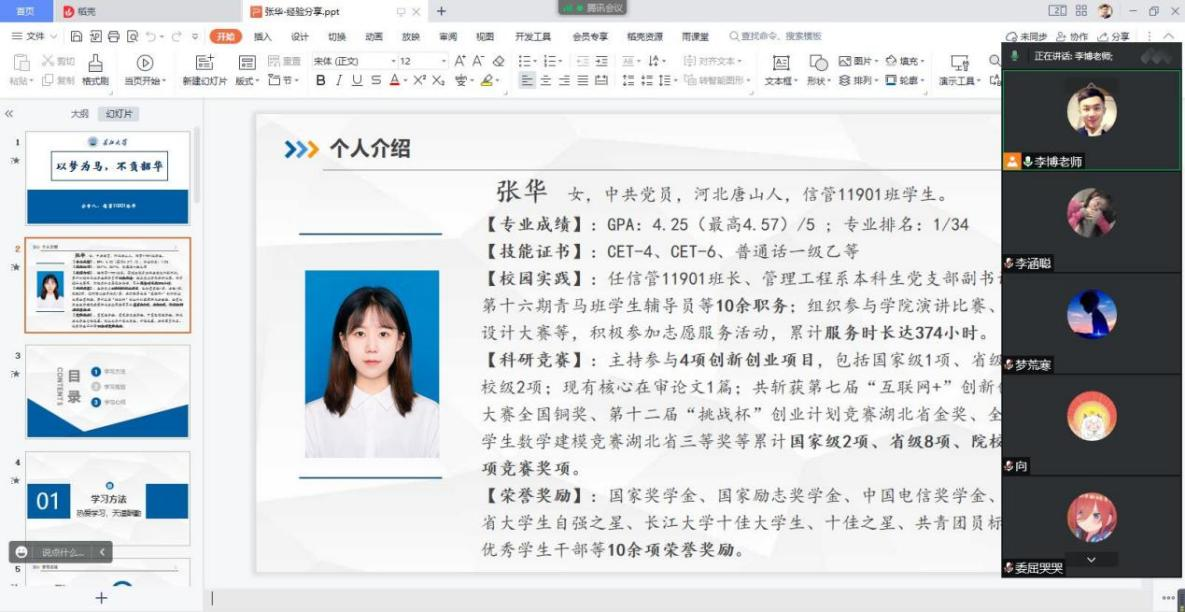 为了加强新生们的学习积极性,树立远大目标,经管学院信管11901班张华同学开展“以梦为马、不负韶华”为主题的分享。她围绕“学习方法”“学习规划”和“学习心得”三个方面展开分享,就同学们的问题进行解答和交流。