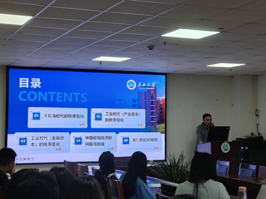 张天勇副教授以《从历史周期看当前宏观经济变局》为主题进行学术分享,主要从资本主义萌芽开始到现在的世界强国发展演化过程中总结规律,论证了为什么中美产生贸易对抗,并分析了中国目前宏观经济中存在的问题,以及竞争中的优势,最后提出了中国的应对策略。